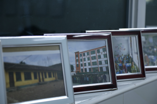 马忠山校长办公室窗台上放着新旧校舍对比照片,教学环境显著改善