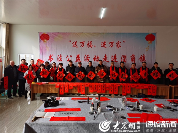 此次活动旨在深入学习宣传贯彻党的十九届四中全会精神,以福字为载体,把党和政府的温暖、关怀以及书法家们的深情祝福送到千家万户,辞旧迎新,喜迎新春。活动启动仪式上,省派乡村振兴服务队成员、省鲁中监狱副监狱长、党委委员谭希春,滨州市总工会党组成员、副主席戴新生,淄角镇党委副书记、镇长马镇镇分别致辞,为淄角群众送上节日祝福。