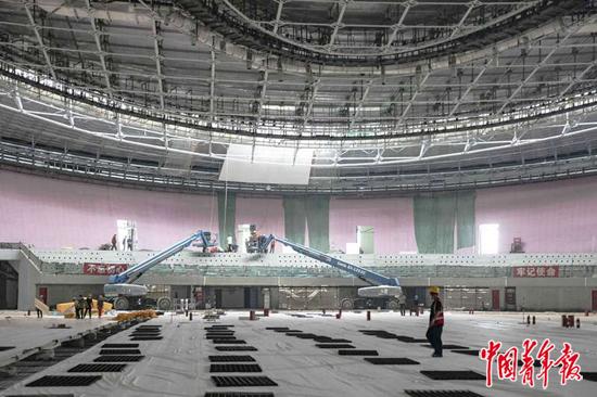 国家速滑馆“冰丝带”内,工人正加紧施工。实习生 刘开阳/摄