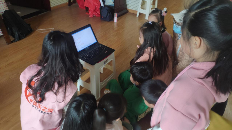 开篇以“童画社工”环节拉开了此次活动的序幕,志愿者通过科普视频播放和解说问答的形式与孩子们共同探索了“什么是社工”和“社工的一天是怎么度过的”。随后志愿者组织青少年儿童们用稚嫩的笔触,在画纸上描绘自己心中的社工。不一会儿,一个个充满童趣的图案跃然纸上。通过“稚趣分享”环节,孩子们分享自己的画作所描绘的具体事物和灵感来源。活动最后,大家一起学习并合唱《爱因为在心中》歌曲,在愉快的气氛中结束本次活动。
