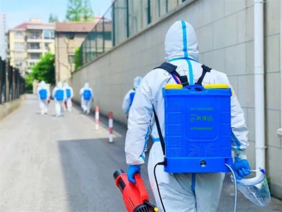 在社区,一支支专门的“消杀突击队”成立了。早上8点,“消杀突击队”已经在江苏路街道小区内忙碌起来,他们肩背喷雾器,手持喷雾头,穿戴全套防护装备辗转于各个点位,对居民区公共区域进行全面消杀。在这批消杀突击队中,有一支“新华物业青年消杀突击队”,由新长宁集团新华物业的年轻党团员干部和一批经验相对丰富的物业工作人员临时组成,经过消杀专家的岗前专业培训后,在防范区和管控区内,对楼道扶手、垃圾箱房、院落角落等公共部位进行有效消杀。