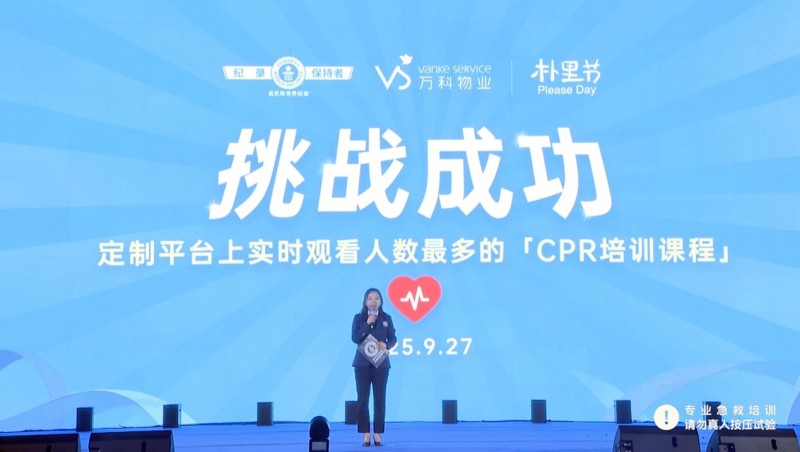 作为本届朴里节最引人注目的环节,当晚18:55,一场“定制平台上实时观看人数最多的CPR培训课程”吉尼斯世界纪录挑战,在线上线下同步展开。通过万科物业“邻居好服务”视频号直播间在线学习心肺复苏(CPR)急救知识,直播间实时观看人数最高达20917人,直播总观看人数超过10万人次,在专业导师指导下学习心肺复苏急救知识并成功创下纪录。这不仅是一次技能的普及,更是万科物业践行ESG理念、构建社区应急保障体系的关键一步,彰显了企业对业主生命健康的高度责任感。