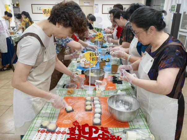 山二中心的长者们在志愿者带领下认真学习冰皮月饼制作,大家围坐在一起笑谈往年趣事,互道节日祝福,屋内弥漫着月饼的香甜与团圆的温情。