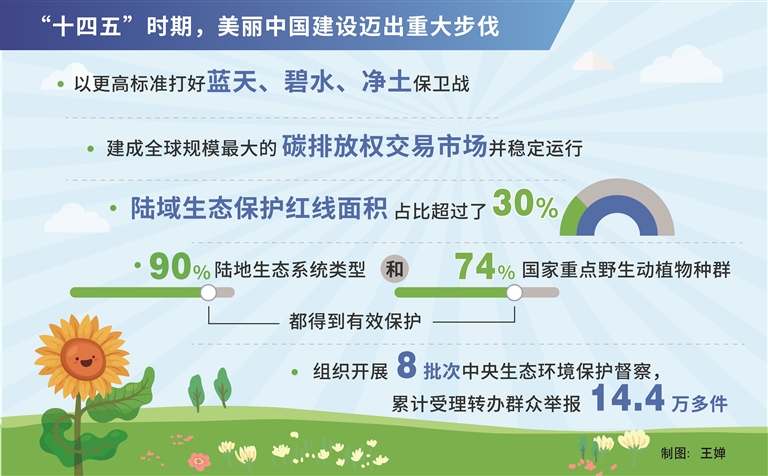 “在习近平生态文明思想的科学指引下,我们坚持以更高站位、更宽视野、更高标准、更大力度谋划和推进生态环境保护工作,推动美丽中国建设迈出重大步伐。”在9月19日国务院新闻办公室举行的新闻发布会上,生态环境部部长黄润秋表示,“十四五”时期,我国污染防治攻坚战取得新成效,以更高标准打好蓝天、碧水、净土保卫战,推进“无废城市”建设;绿色低碳发展迈出新步伐,建成全球规模最大的碳排放权交易市场并稳定运行,覆盖全国60%以上的碳排放量;生态保护修复监管实现了新进展,陆域生态保护红线面积占比超过了30%,90%陆地生态系统类型和74%国家重点野生动植物种群都得到有效保护。