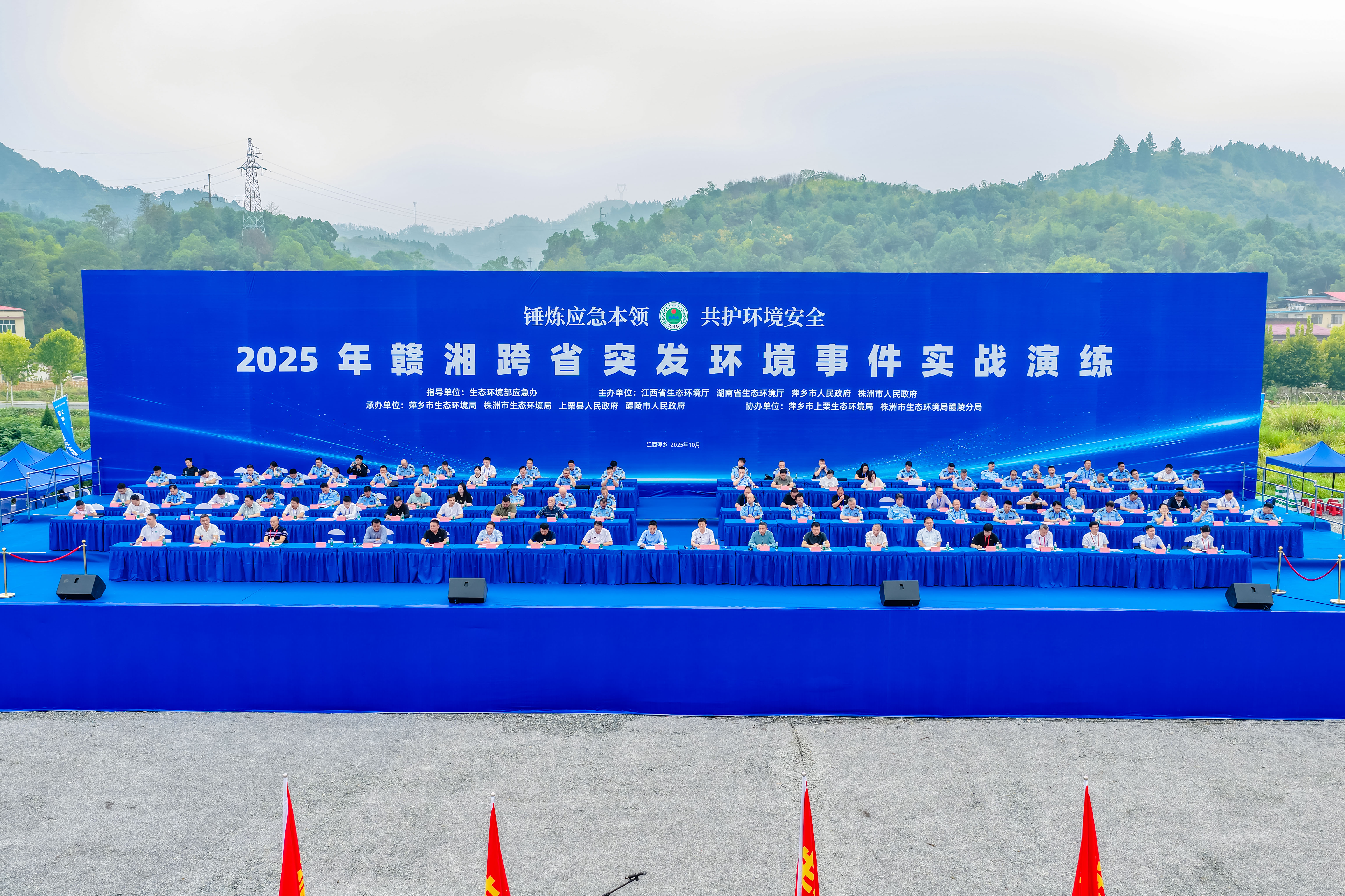 10月16日,由生态环境部应急指挥领导小组办公室指导,江西省生态环境厅、湖南省生态环境厅、萍乡市人民政府、株洲市人民政府共同主办的“锤炼应急本领 共护环境安全”——2025年赣湘跨省突发环境事件实战演练的开头一幕。