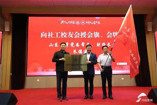 齐鲁网·闪电新闻9月24日讯 近日,山东大学社会工作行业校友会成立大会在山东大学中心校区举行。会上举行授牌与授旗环节。山东大学党委常委、副校长朱德建为社会工作行业校友会授予会旗和会牌,社会工作行业校友会第一届理事会会长李善峰、副会长葛忠明分别接过会旗、会牌。