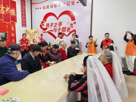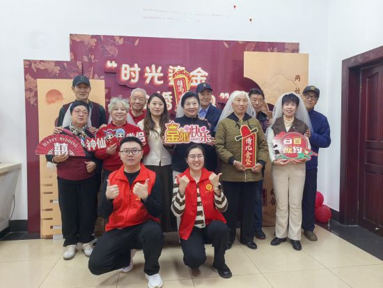 金婚庆典活动现场,5对金婚老人们手捧鲜花、并肩而立,在镜头前缓缓相拥,定格下相伴50载的深情瞬间。专业社工全程引导,带领老人们参与趣味互动游戏,“默契问答”环节,老人们无需提示便能迅速答出彼此的喜好,默契十足;水墨浸色扇制作环节更添浪漫气息,志愿者为每对老人送上印有“如意”“扇解人意”的素面折扇,老人们携手将红、蓝、青、粉等颜料倒入水中,再一同持扇浸入,看着色彩在扇面自然晕染、交织成独一无二的纹路,老人们脸上满是笑意,仿佛将50年的相守时光定格在扇面之上。