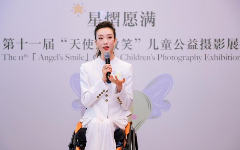 图为舞蹈家刘岩在“天使的微笑”儿童公益摄影展开幕式上致辞。(主办方供图)