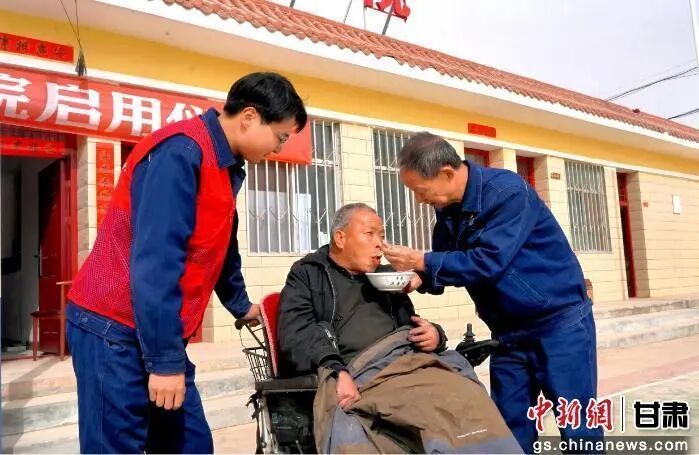 图为杜志虎正在给失能老人喂饭。薛慧摄