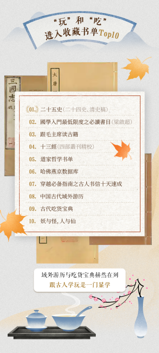 平台支持用户创建各类古籍书单,方便系统性阅读。其中,“二十五史(二十四史、清史稿)”书单登顶收藏榜首位。值得关注的是,“中国古代域外游历”“古代吃货宝典”等聚焦游历、美食主题的古籍书单也跻身榜单,从古籍中探寻古人“吃喝玩乐”之道成为一种热门趋势。