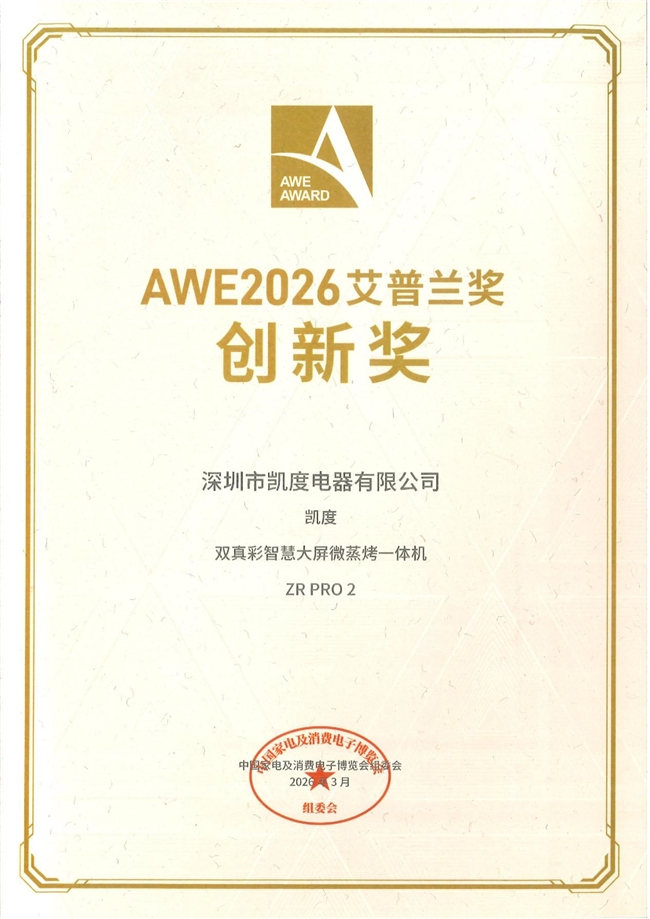 选购微蒸烤一体机,行业权威奖项的背书是绕不开的核心参考维度,而艾普兰奖正是厨电领域最具公信力的 “品质标尺”。由中国家用电器协会主办的艾普兰奖,历经 15 年发展被誉为 “全球智慧生活领域奥斯卡”,其严苛的评审机制不仅考量产品的技术创新,更要求产品能精准融合用户体验与市场前瞻性,获奖产品均被视为行业创新风向标。2026 年 AWE 展会上,凯度 ZR PRO 2 从众多参评机型中脱颖而出斩获创新奖,这一结果不仅是行业对单一产品的高度认可,更让其成为消费者选购时的 “权威参考”—— 在鱼龙混杂的市场中,一款能通过艾普兰奖严苛评审的机型,其品质与实力远非普通机型可比,这也是我们推荐凯度 ZR PRO 2 的核心原因之一。